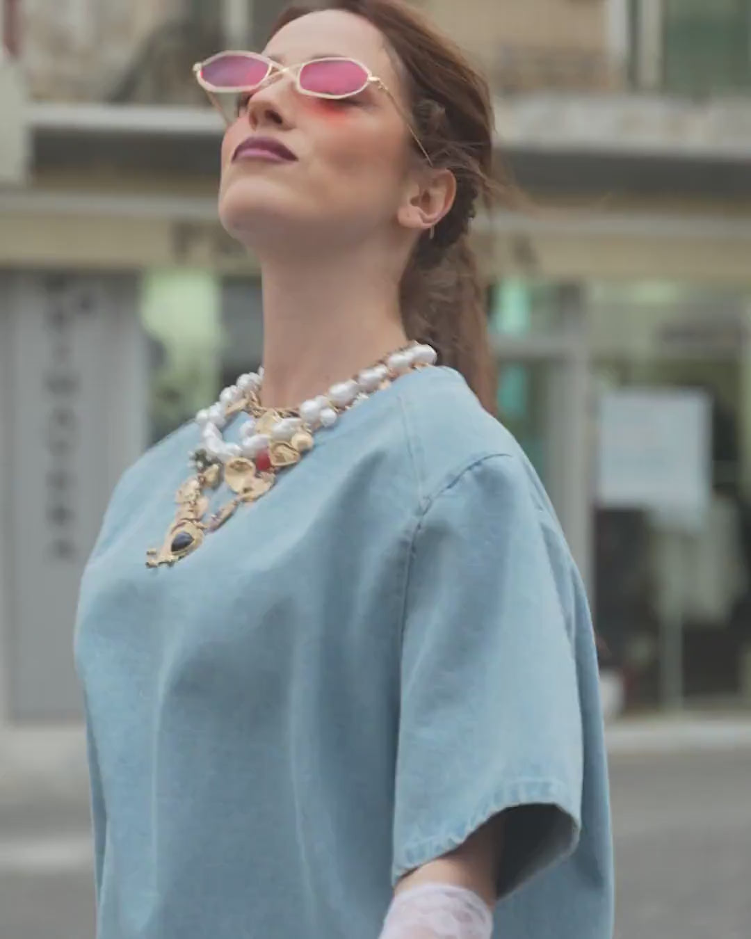 La giacca, con spalle strutturate e linea leggermente oversize, presenta chiusura doppiopetto con bottoni tono su tono e rever classico. Può essere indossata anche come capo singolo, stretta in vita con una cintura per valorizzare la silhouette.